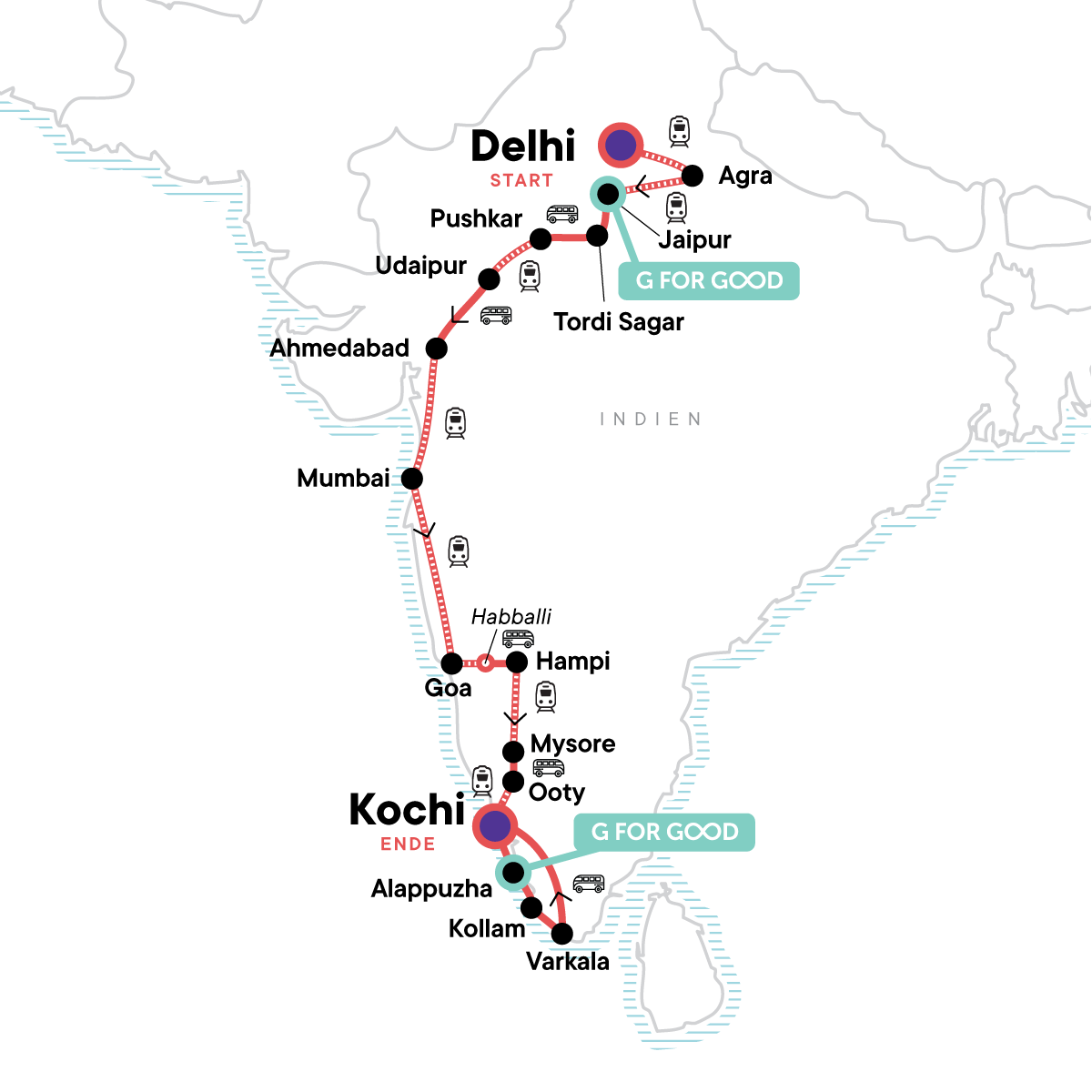 Dein Big-Night-Out-Moment: Nachtleben in Kochi, Kochi. Guided tour of the Taj Mahal and the Amber Fort. Orientation walks in Jaipur, Pushkar, Udaipur, and Mumbai. Visit to Gandhi Ashram. Village walk in rural Tordi Sagar. Sunrise at Savitri temple. Free time in Hampi, Ooty. Hampi Ruins Walking Tour. Kishkinda Foundation Visit. Anjaneya Temple Sunset. Devaraja Market Visit. Chamundi Hills Visit. Monolithic Bull Visit. Dodapetta Peak. Dodapetta Tea Factory. Fort Kochi Visit. Orientation walks in Alleppey, Kollam, and Fort Kochi. Morning ferry cruise on Alleppey's backwaters. All transport between destinations and to/from included activities